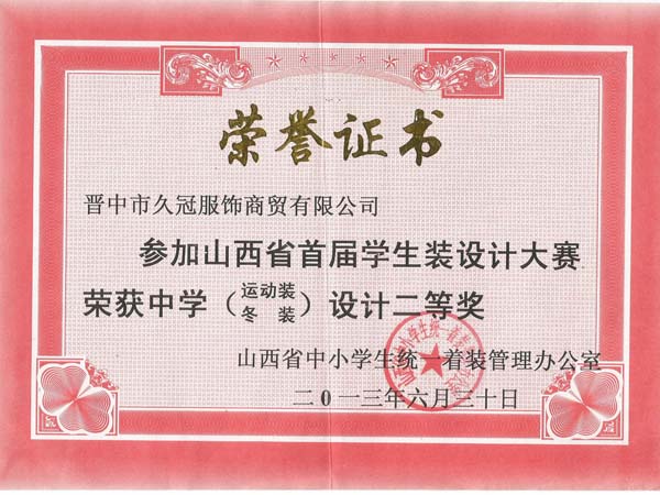 山西久冠服飾有限公司位于晉商故里山西省晉中市。公司注冊商標“久冠”,是山西省教育學會學生服被裝專業委員會會長單位,中國質量萬里行促進會理事單位,中國教育裝備行業協會學校后勤裝備管理分會常務理事單位。